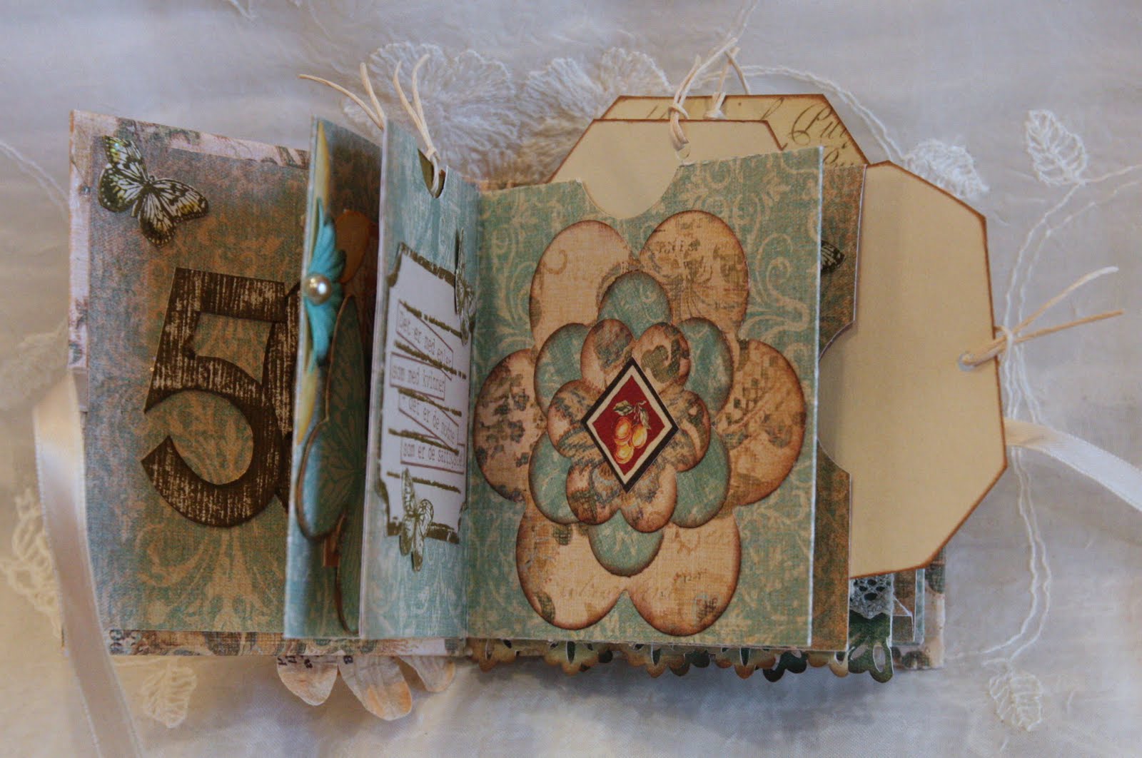En meander book til en venninne som fyller 50. Alle sidene i boken, med plass til tags, er laget av ett ark som brettes på en spesiell måte. Det var gøy å lage denne. jeg klarer ikke å forklare fremgangsmåten, så du finner oppskriften her Jeg legger denne inn hos trykkpressa. Der skulle fargene være Turkis, grønn og krem.